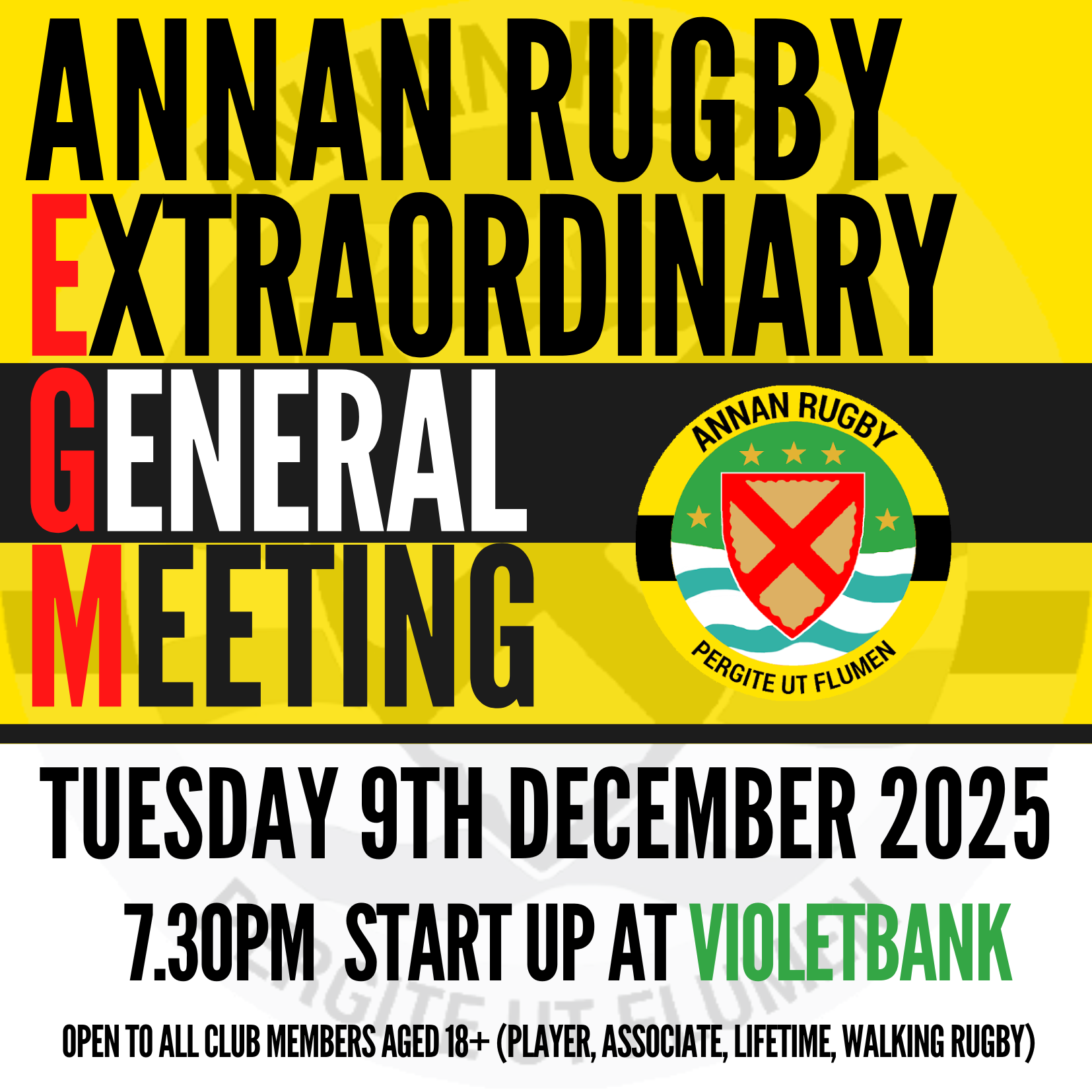 An Extraordinary General Meeting (EGM) of Annan Rugby Club will be held on Tuesday 9th December 2025, 7pm start up at Violetbank, Annan.