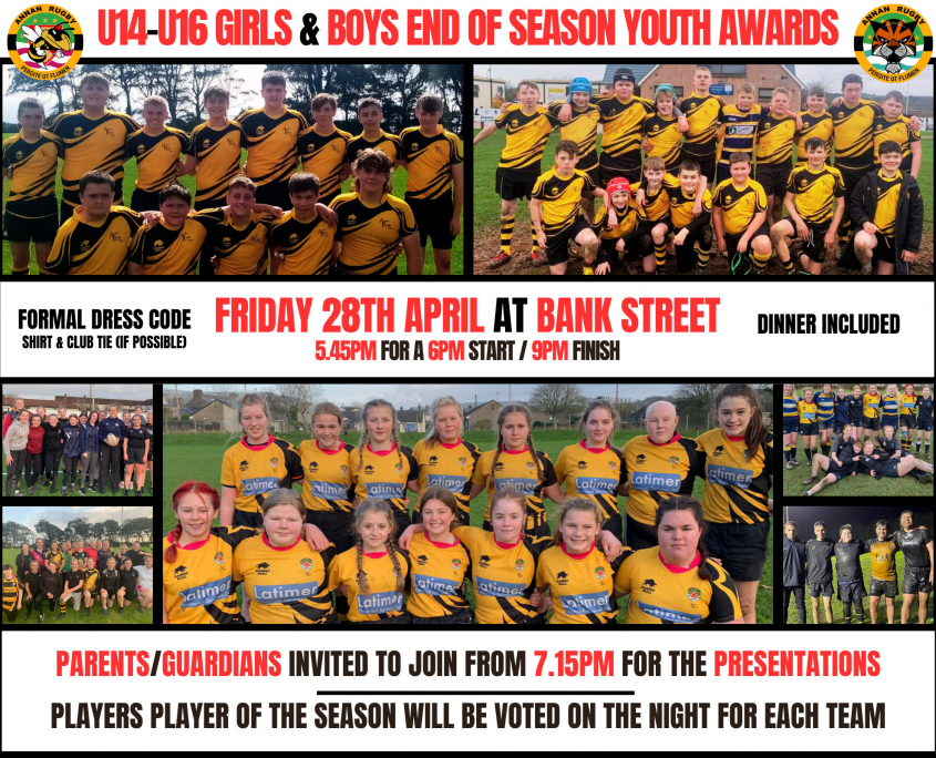 U14-U16 Boys and Girls End of Season Awards Night will be on Friday 28th April at 17 Bank Street