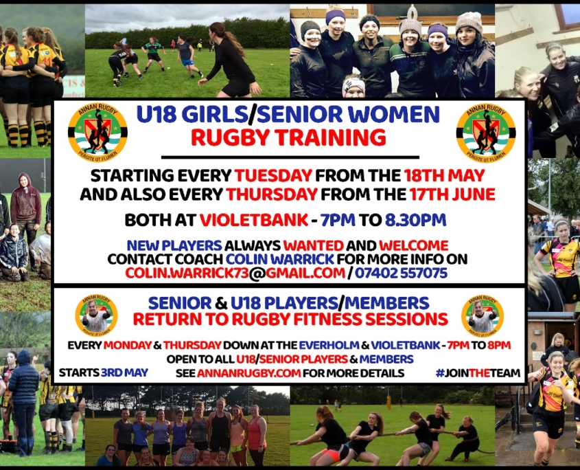 The Annan Warriors and U18 Girls rugby training restarts on Tuesday 18th May at Violetbank. 7pm to 8pm.