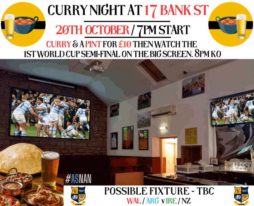 Curry Night at the Rugby club on Friday 20th October. 7pm sit down for the 8pm KO.