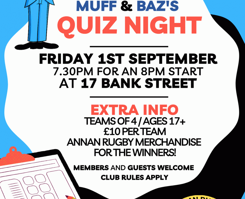 MUFF & BAZ'S QUIZ NIGHT Friday 1st September at 17 Bank Street. 7.30pm for a 8pm start. Teams of 4 / £10 per team