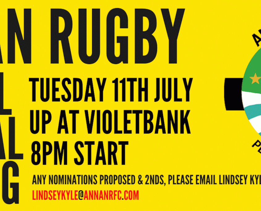 The 2023 Annan Rugby AGM will be held on Tuesday 11th July, 8pm start up at Violetbank