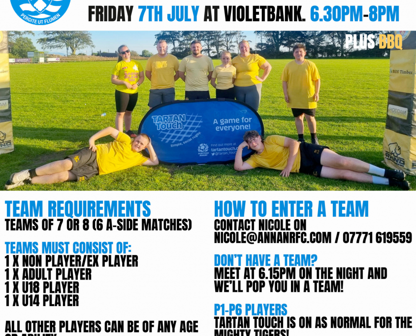 To end this years Tartan Touch Rugby, there will be a Tartan Touch Festival up at Violetbank on Friday 7th July. 6.30pm start