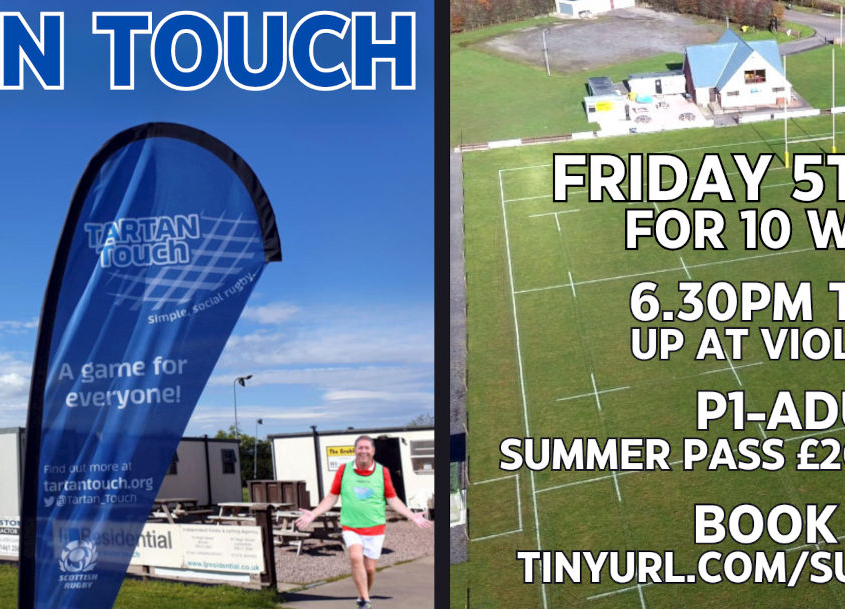 Tartan Touch is back and starts on Friday 5th May for 10 weeks until Friday 7th July. 6.30pm-8pm - up at Violetbank. P1-Adult: Players, Parents, Siblings, Grannys all welcome! U16's free, otherwise £3 per session #TartanTouch