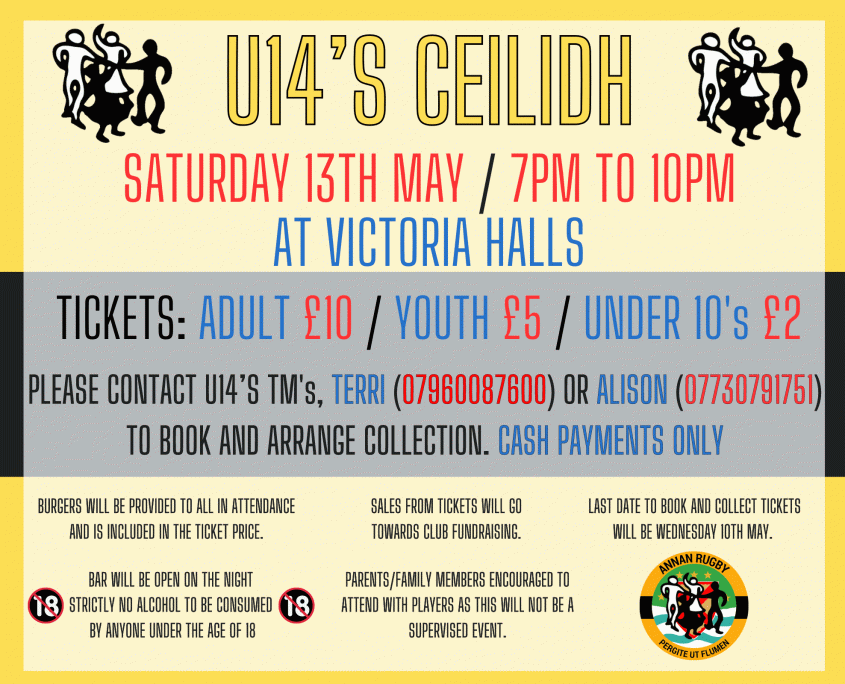 The U14's Ceilidh will be on Saturday 13th May at Victoria Halls. All welcome